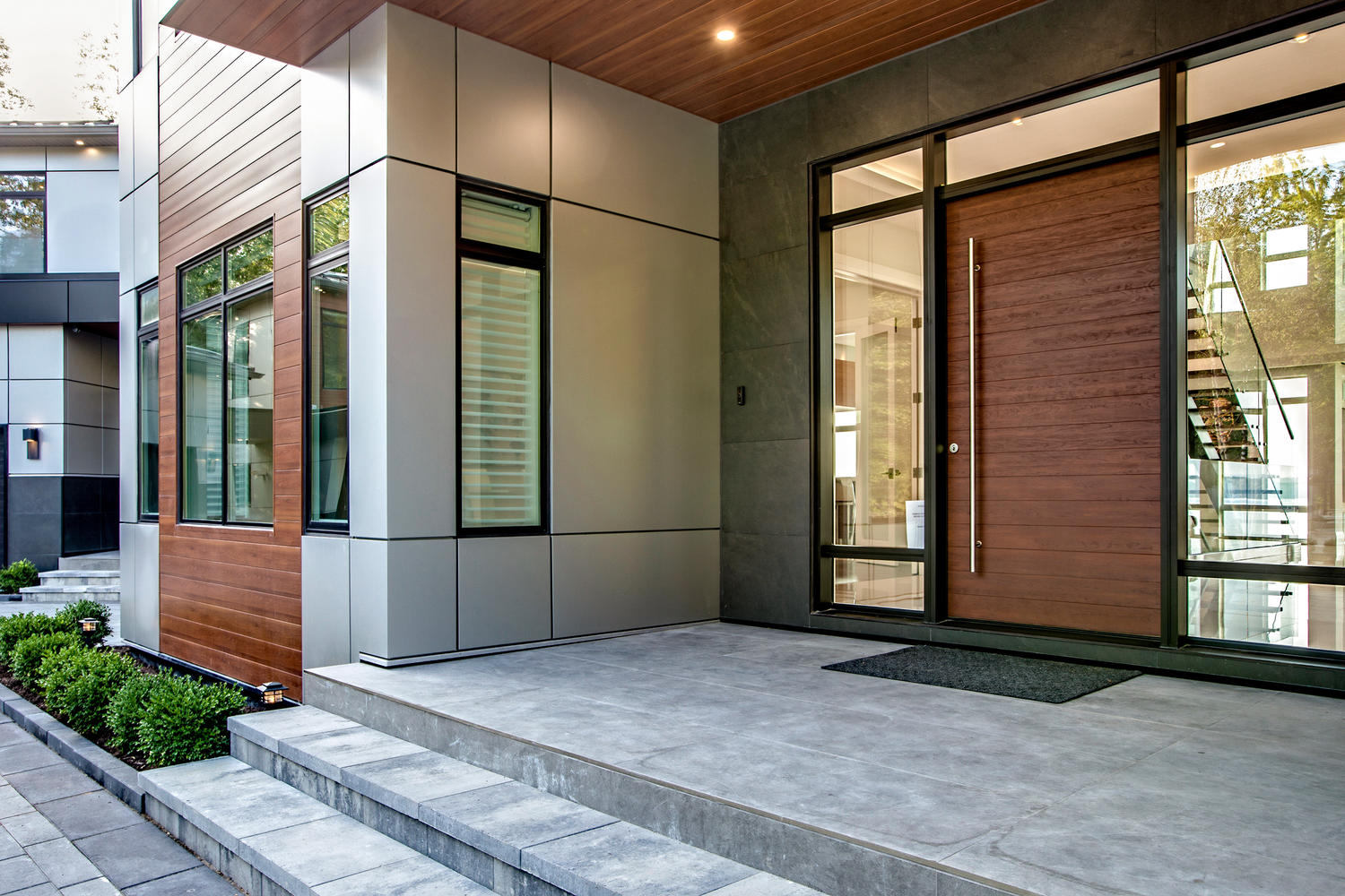 The entry sequence is deliberately compressed to save the view. A deep overhang, oversized pivot door and framed porch create a controlled threshold before the lake is revealed. Materials at the front step — stone, metal and warm wood — echo the palette that continues through the interior, setting a calm modern tone before the lake views open up.