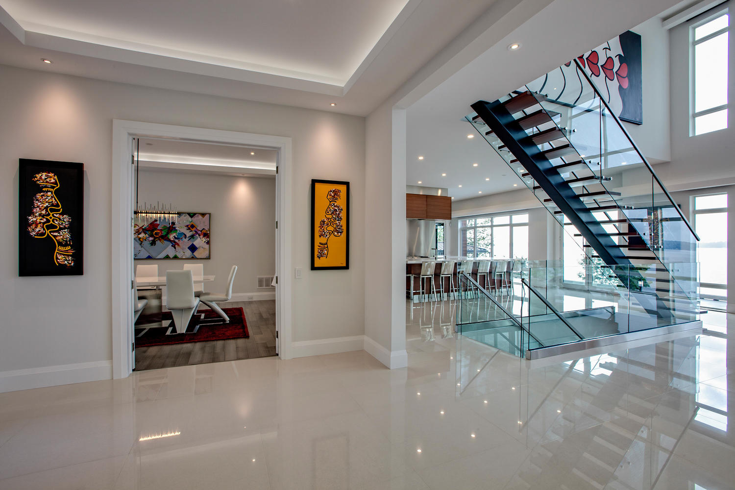 A mono-stringer stair with glass guards sits visibly between foyer and lake wall, dividing space without severing sightlines. It acts as a sculptural spine tying ground floor, upper gallery and walkout club floor together. The lightness of the stair keeps the double-height volume open, allowing views and light to pass through rather than stopping at it.