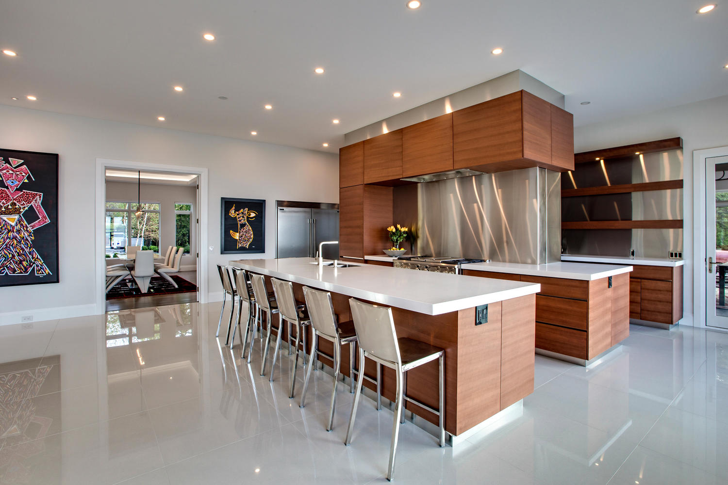 The kitchen is organized as a sequence of pantry, breakfast kitchen and main working kitchen, culminating in a long island that anchors the social core of the house. From the island you read directly into the double-height family room and out across the pool and lake. Finishes are restrained and modern so the space carries daily use and larger gatherings without feeling busy or over-styled.