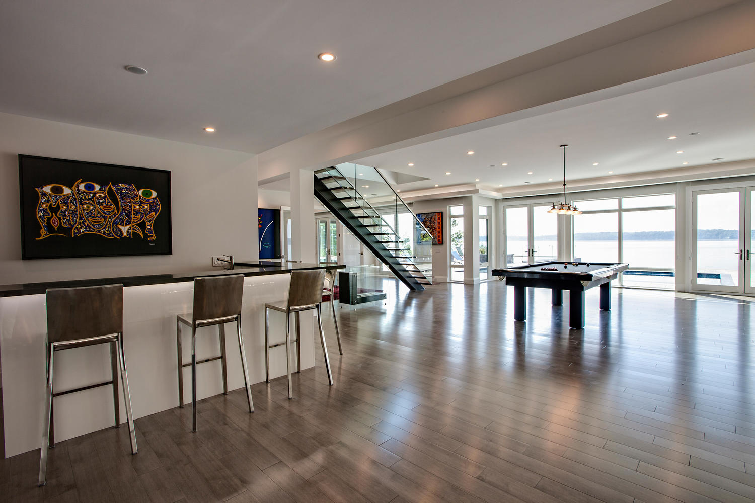 The walkout level is set up as a club floor rather than a typical basement. At the lake level, a recreation space with bar opens directly to the terraces, supported by a home theatre, gym and wellness spaces. The vertical connection from gallery to great room to club floor means the entire house reads as one interconnected volume, not three isolated storeys.