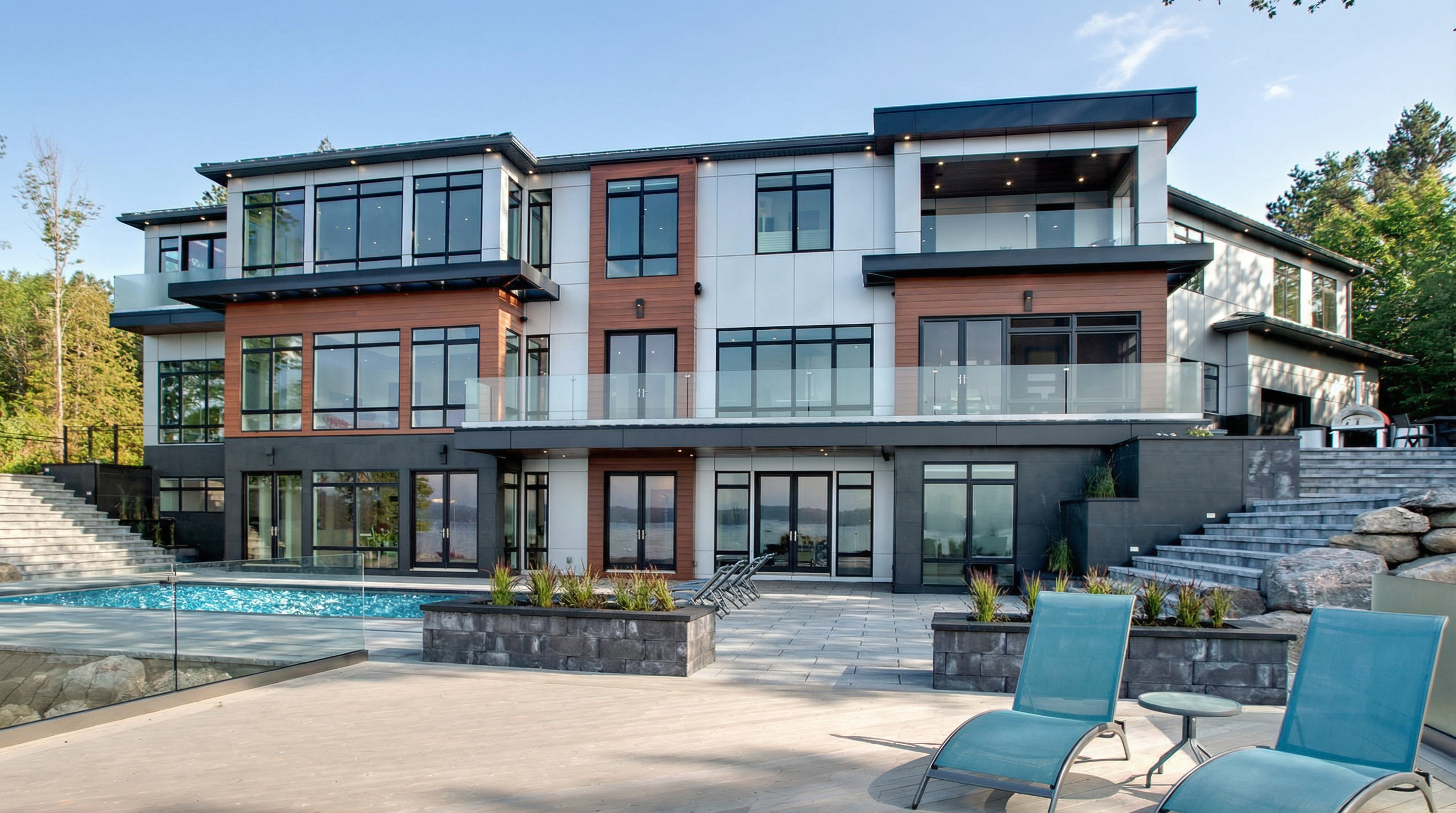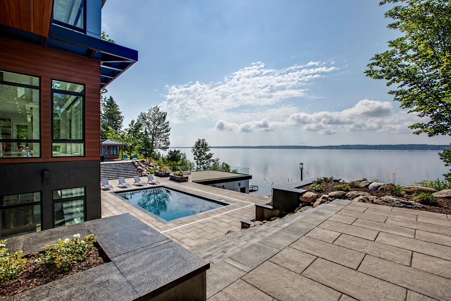 Landmark Lakefront is a fully realized modern-contemporary residence on Lake Simcoe, designed around unbroken water views, a sculptural mono-stringer stair and seamless transitions between interior living, covered terraces and a tiered stone waterfront landscape. Commissioned by Canadian artist Zarum and later sold for just under eight million dollars, it stands as a built example of Lamadeleine Design's modern lakefront capability.