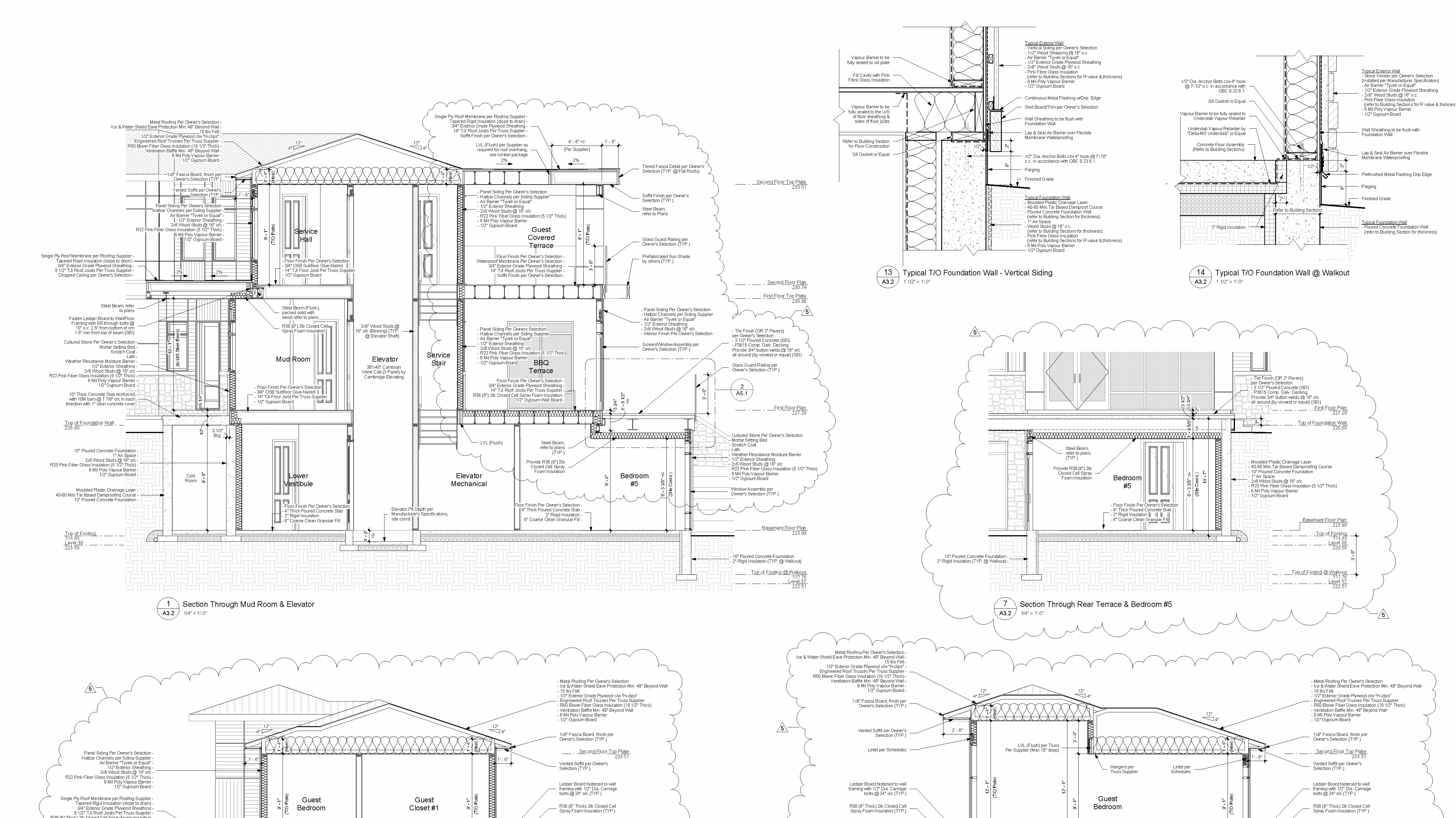 Garage, terraces and retaining structures are integrated into the architectural composition and grading strategy to meet conservation and shoreline requirements while still delivering a fully engineered, low-maintenance waterfront. The result is a house that looks straightforward in elevation and section because the complexity has been resolved in the background.