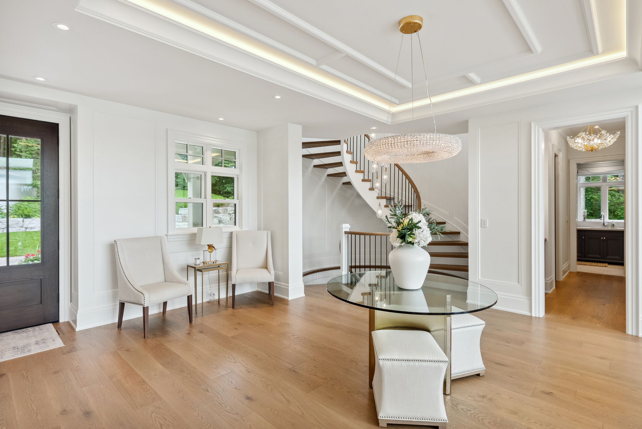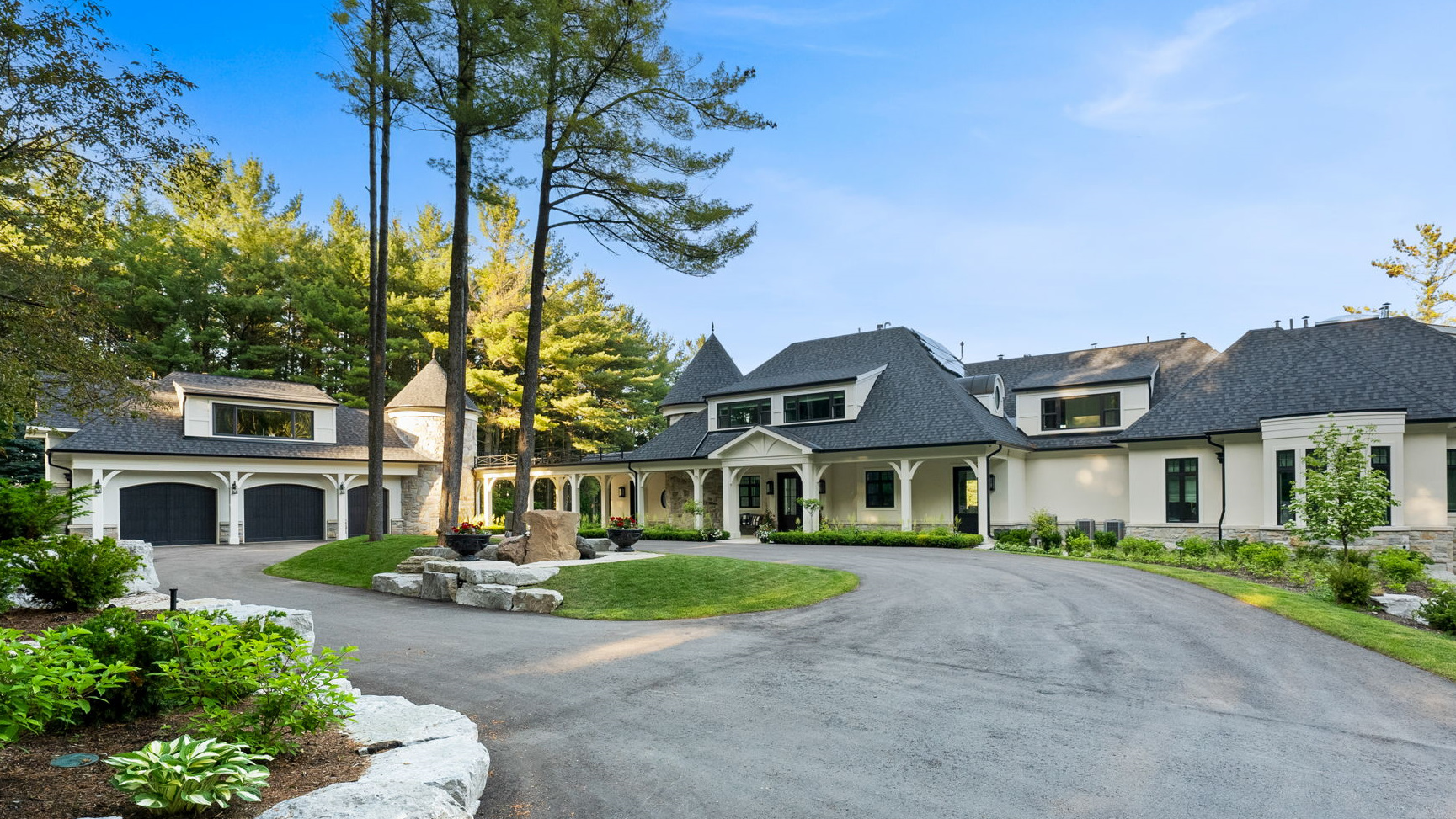 At the front, the arrival court explains the entire campus at once. The re-proportioned dormers, refreshed facade and calibrated rooflines give the main house a composed, European-inspired presence, with garages and links folded into the architecture rather than tacked on. The drive court now works as a formal entrance sequence, not just a place to park.