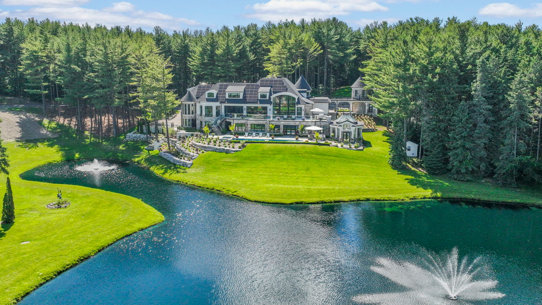 In daylight, the discipline is even clearer. The house stretches along the primary pond, tying the main living spaces, pavilion and conservatory together over a series of stone terraces. The pool and hot tub are integrated into this system rather than feeling like separate backyard projects, and the grounds sit as a manicured foreground to the forest edge.