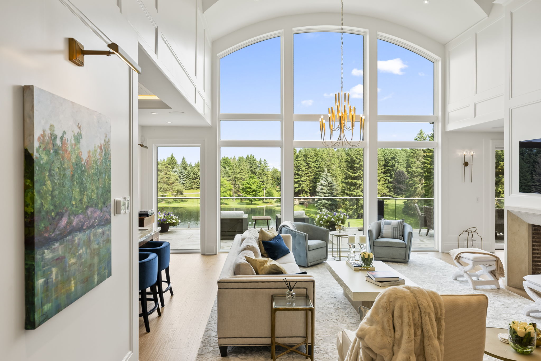 From the opposite angle, the great room shows its true role: a viewing gallery over the ponds and grounds. Enlarged glazing and careful ceiling work frame the water and lawns without visual noise. Dining and kitchen now share this frontage, so the spaces where the family actually lives and hosts get the best outlook, not leftover corners of the plan.
